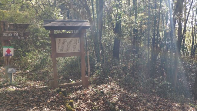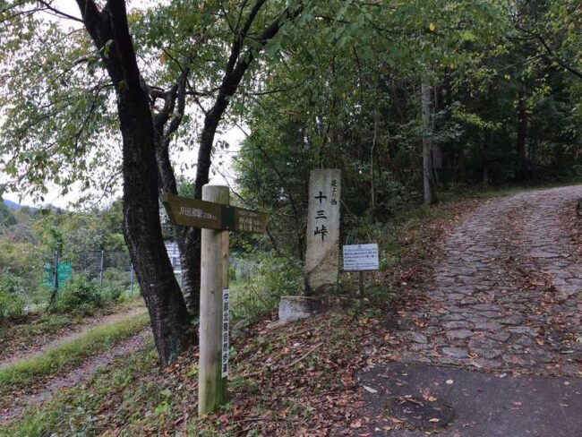 今日のウォーキングの大湫宿方面から大井宿までのコースを歩いてきますとここで10kmくらい上ったり下りたりを繰り返す「十三峠」が終わります。今日は気づかずに来てしまいましたが、下のような標識があります。2018年の写真です。