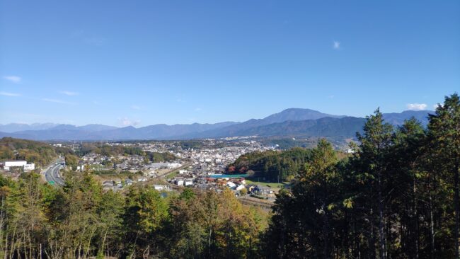 「西行塚」には展望台が併設されており、恵那山から中央アルプスまで展望できます。町並みは恵那市です。