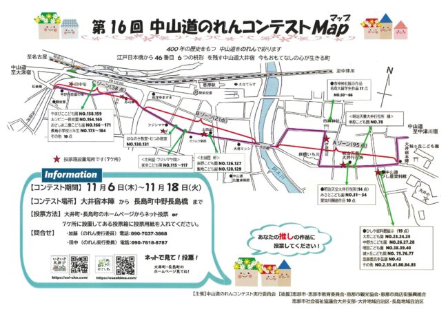 中野村庄屋の家にも暖簾がかかっていますが、旧中山道の商店街では「第16回中山道のれんコンテスト」が行われていました。