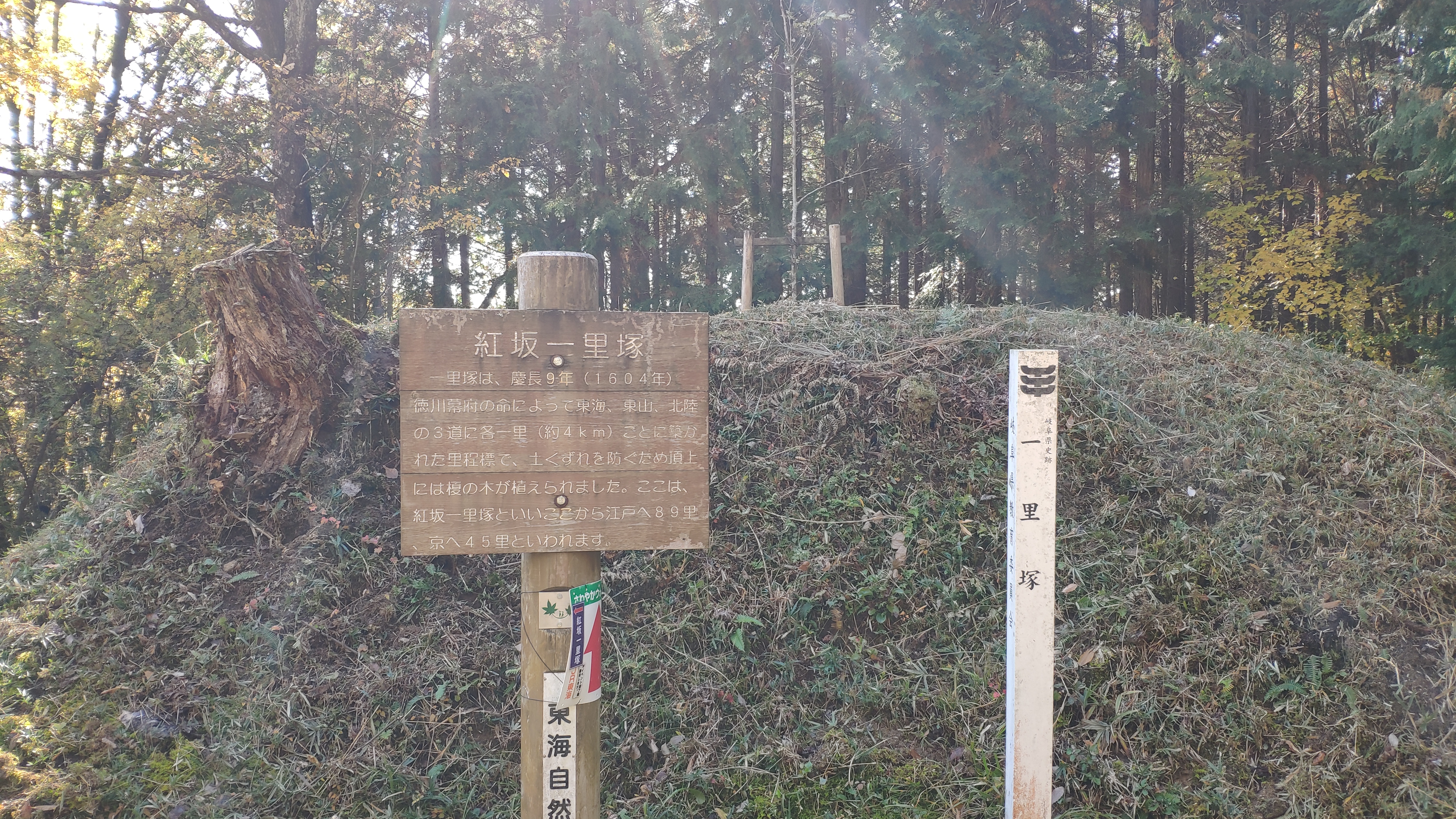 一里塚は、慶長9年(1604)徳川幕府の命によって東海、東山、北陸の3道に各一里(約4km)ごとに築かれた里程標で、土くずれを防ぐため頂上には榎の木が植えられました。ここは、紅坂一里塚といいここから江戸へ89里、京へ45里といわれます。