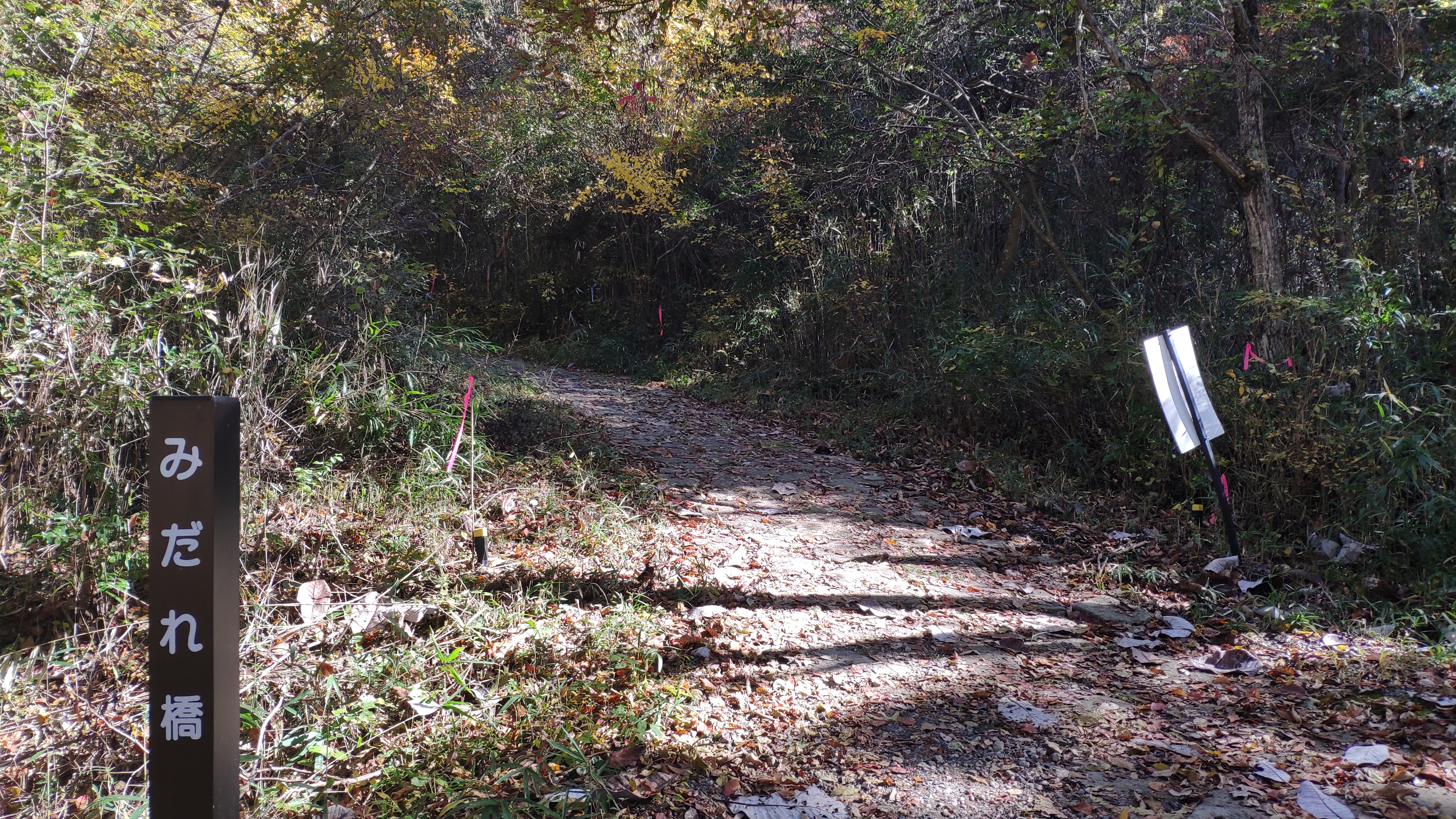 「乱れ坂」みだれ橋とあるのは写真の手前の橋の表記で、この杭の反対側にはみだれ坂と書かれています。
