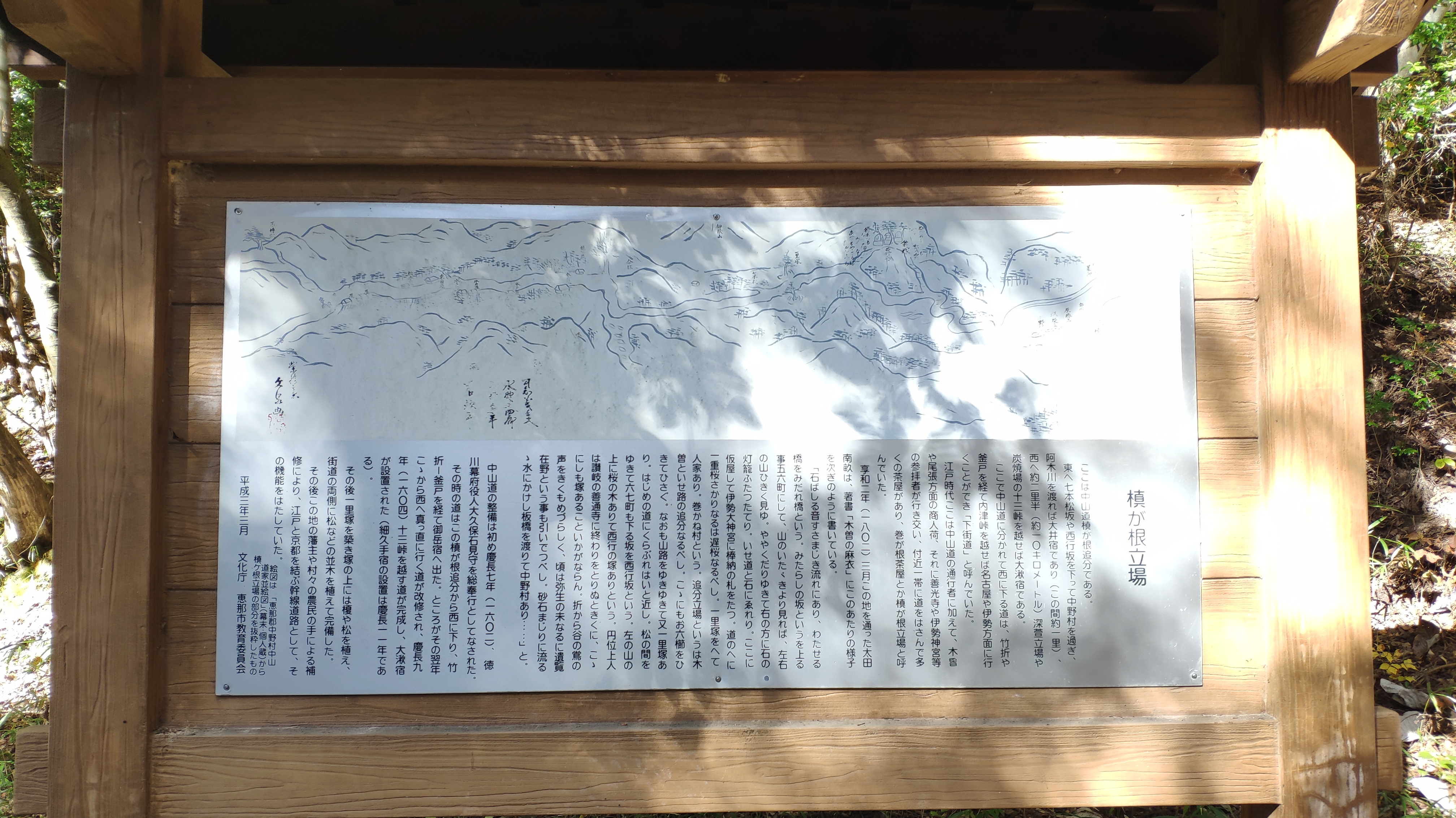 今日のウォーキングの大湫宿方面から大井宿までのコースを歩いてきますとここで10kmくらい上ったり下りたりを繰り返す「十三峠」が終わります。今日は気づかずに来てしまいましたが、下のような標識があります。2018年の写真です。