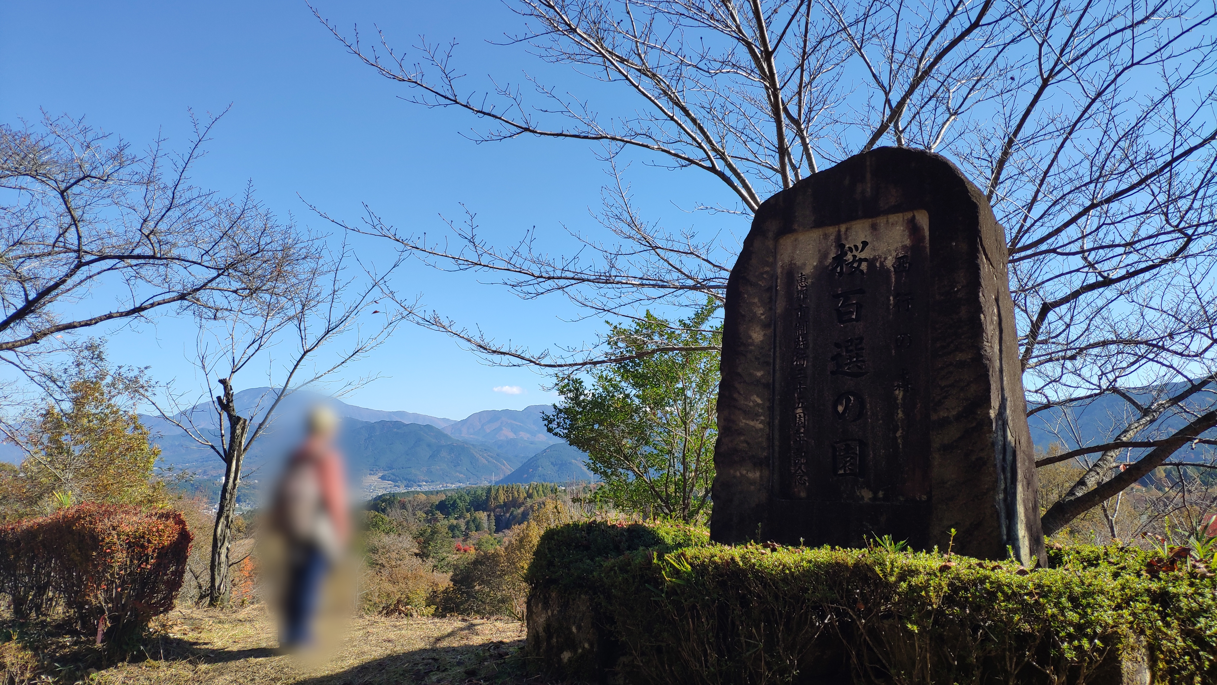 「西行塚」には展望台が併設されており、恵那山から中央アルプスまで展望できます。町並みは恵那市です。