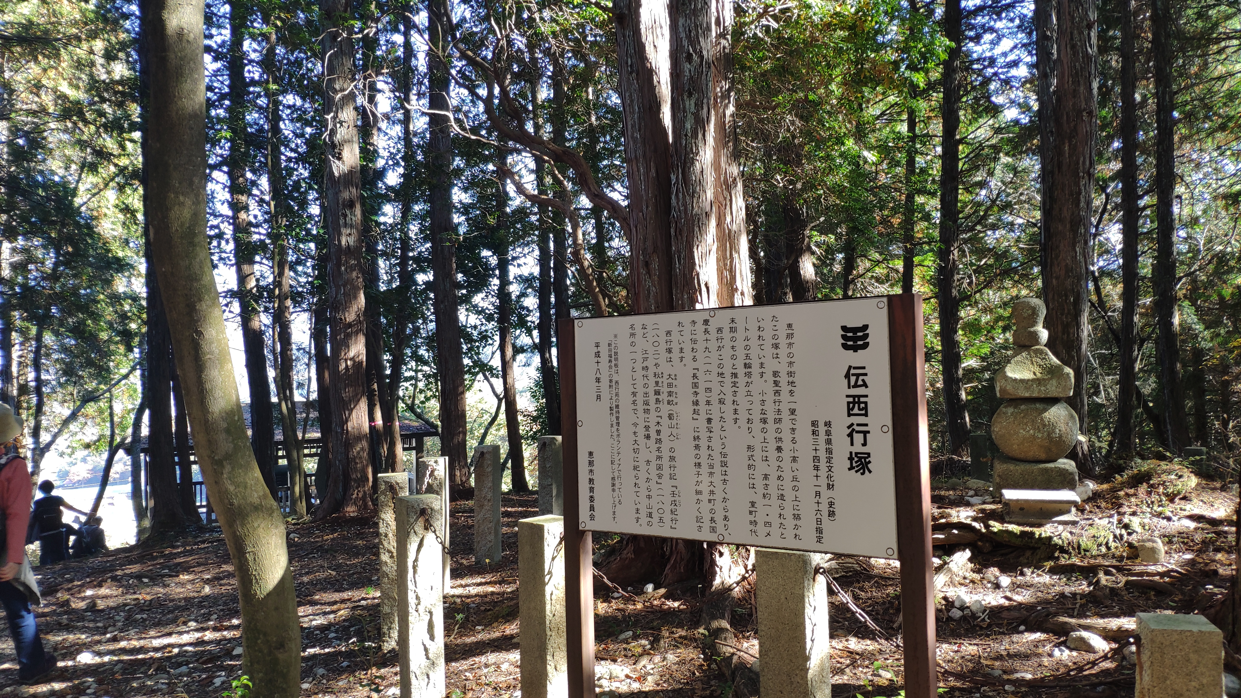 恵那市の市街地を一望できる小高い丘の上に築かれ、この塚は、歌聖西行法師の供養のために造られたといわれています。小さな塚の上には、高さ約一・四メートルの五輪塔が立っており、形式的には、室町時代期のものと推定されます。西行がこの地で入寂したという伝説は古くからあり、「慶長十九(一六(四)年に書写された「大井町の長国寺に伝わる『長国寺縁起』に終焉の様子が細かく記されています。