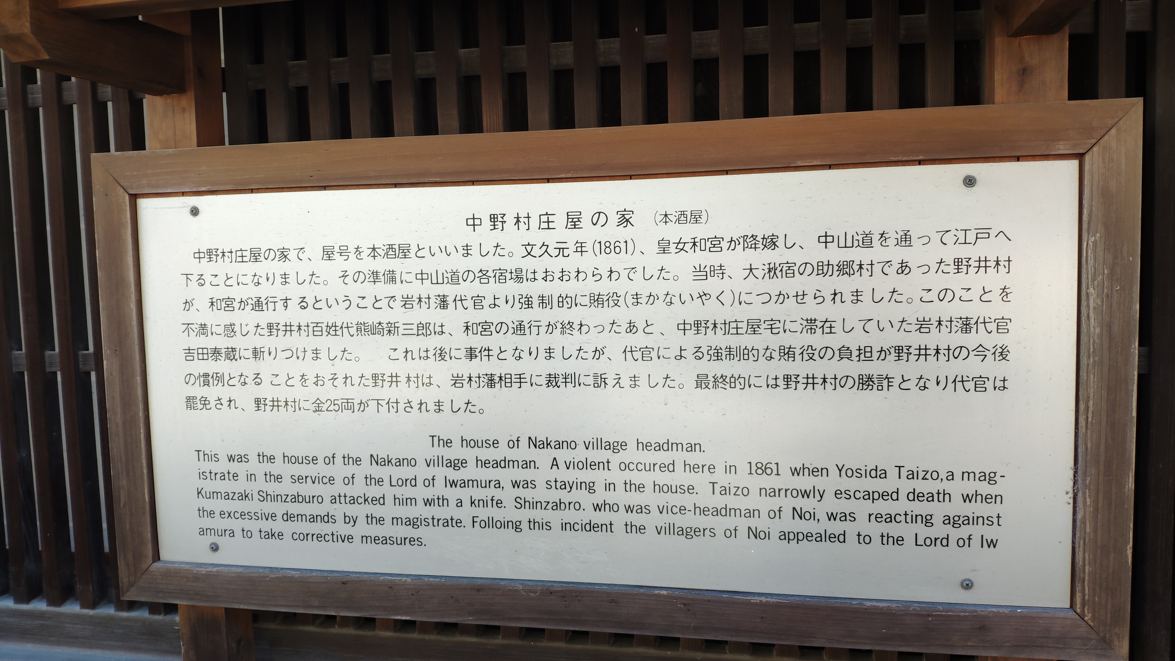中野村庄屋の家で、屋号を本酒屋といいました。文久元年(1861)、皇女和宮が降嫁し、中山道を通って江戸へ下ることになりました。その準備に中山道の各宿場はおおわらわでした。当時、大湫宿の助郷村であった野井村が、和宮が通行するということで岩村藩代官より強制的に賄役(まかないやく)につかせられました。このことを不満に感じた野井村百姓代熊崎新三郎は、和宮の通行が終わったあと、中野村庄屋宅に滞在していた岩村藩代官吉田泰蔵に斬りつけました。これは後に事件となりましたが、代官による強制的な賄役の負担が野井村の今後の慣例となることをおそれた野井村は、岩村藩相手に裁判に訴えました。最終的には野井村の勝訴となり代官は罷免され、野井村に金25両が下付されました。