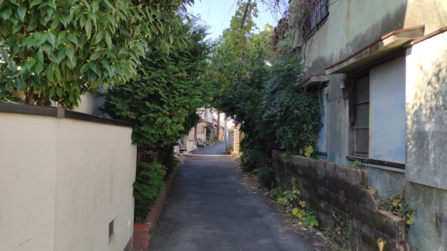 GoogleMap では候補としては出ないルートですが、熱田神宮西駅のある交差点から西に50mくらい行きますと細い路地があります。そこの写真です。いい感じですね。