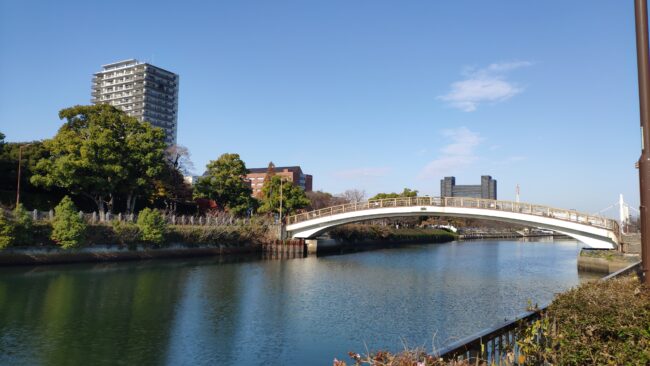 堀川にかかる御陵橋、この辺りの堀川は比較的水量もありきれいです。橋の向こうは名古屋国際会議場、足場で覆われていますので工事中ですね。