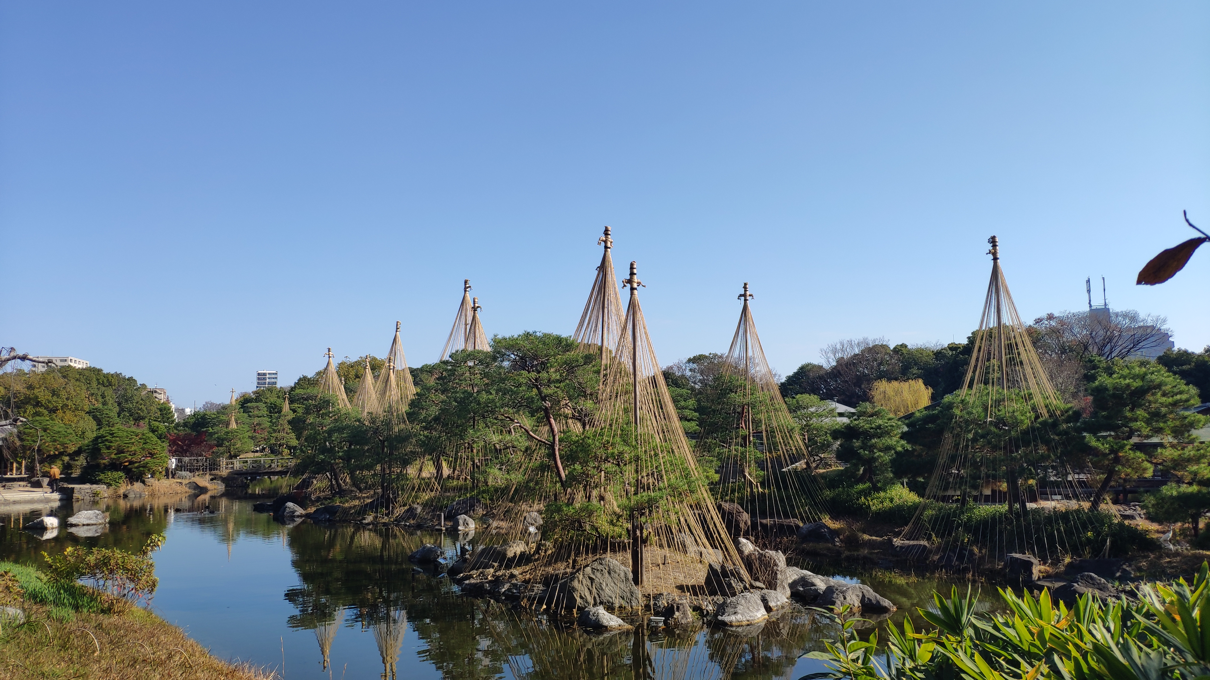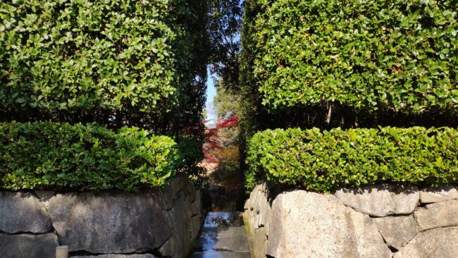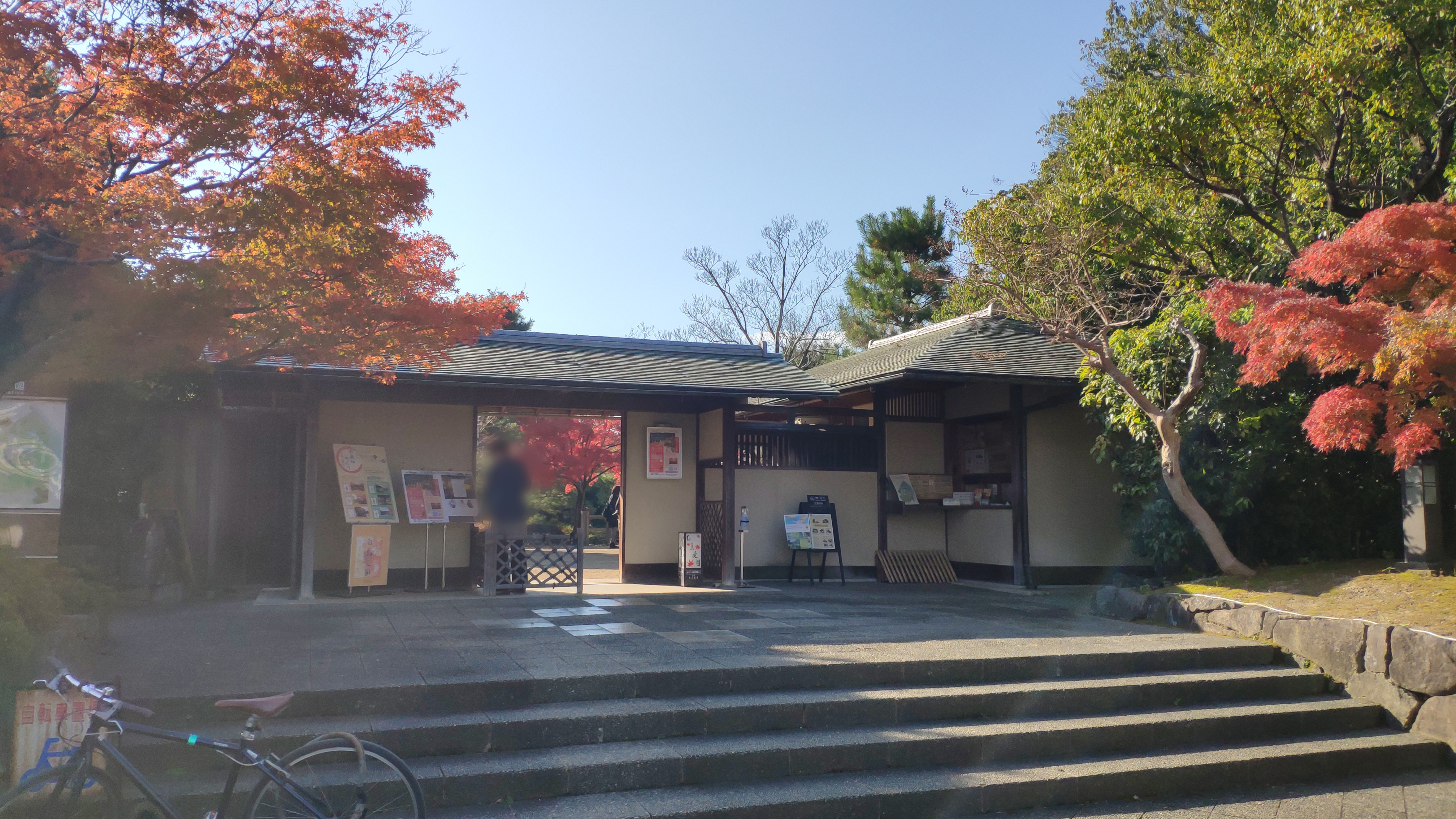 正門入ってすぐにある「覗き」という造園技法、庭園の外にある風景を庭園の一部として取り込むという借景の技法ということです。国際会議場が見えるはずですが、見えるのはマンションですね(笑)。クリックして拡大してみてください。
