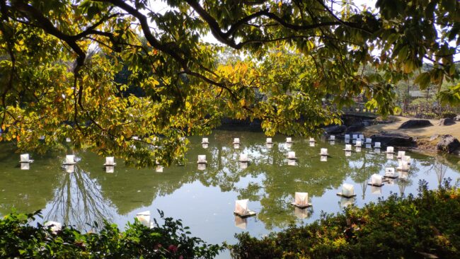 池に浮かべられた灯籠、夜になれば明かりがつき幻想的な雰囲気になるのでしょう。