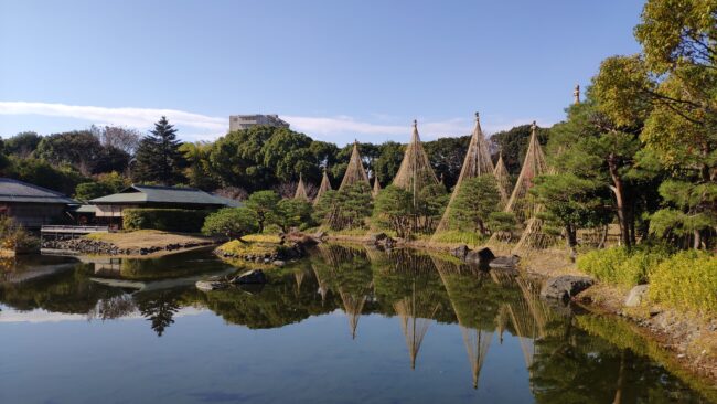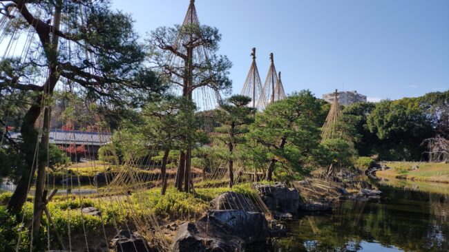 雪吊り、これも夜になるとライトアップされます。その向こうに見えるのは清羽亭だったと思います。