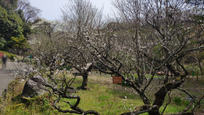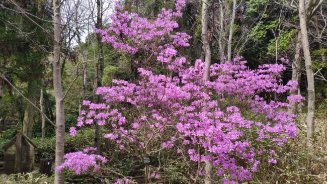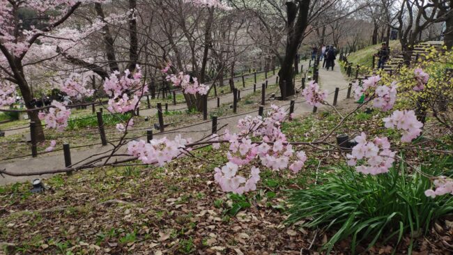 しばらくは桜ではなく様々な草木を見ながら歩きます。入ってすぐの「ハヤトミツバツツジ」枝先に3枚の菱形の葉をつけることからの命名らしいです。まだ葉が出ていませんね。
