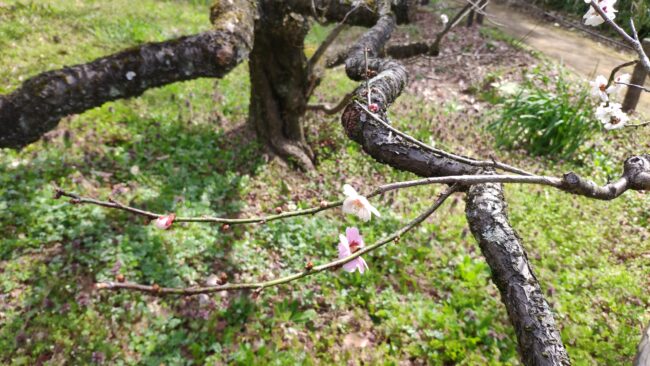 5種類の「ぼけ」が一ヶ所に植えられています。真ん中の「国華」は赤と白の花が混じり合っています。梅だけじゃなくぼけにもあるんですね。