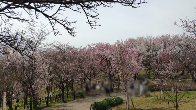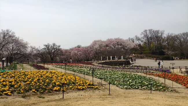 お花畑越しに桜の回廊がみえてきました。