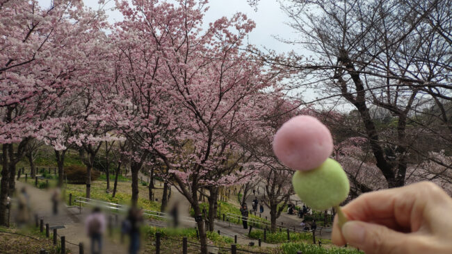 「両口屋是清」の花見団子と桜。団子にピントを合わせるべきでした。