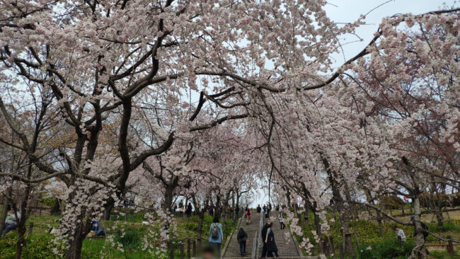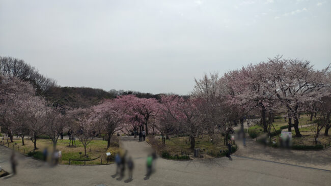 桜の回廊をぐるりとまわり、広場の休憩所の上からです。