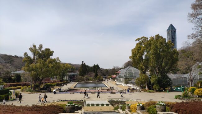 「ガーデンステージ」という場所になるんでしょうか、「スイレン池」と「温室」と「東山スカイタワー」を望みます。