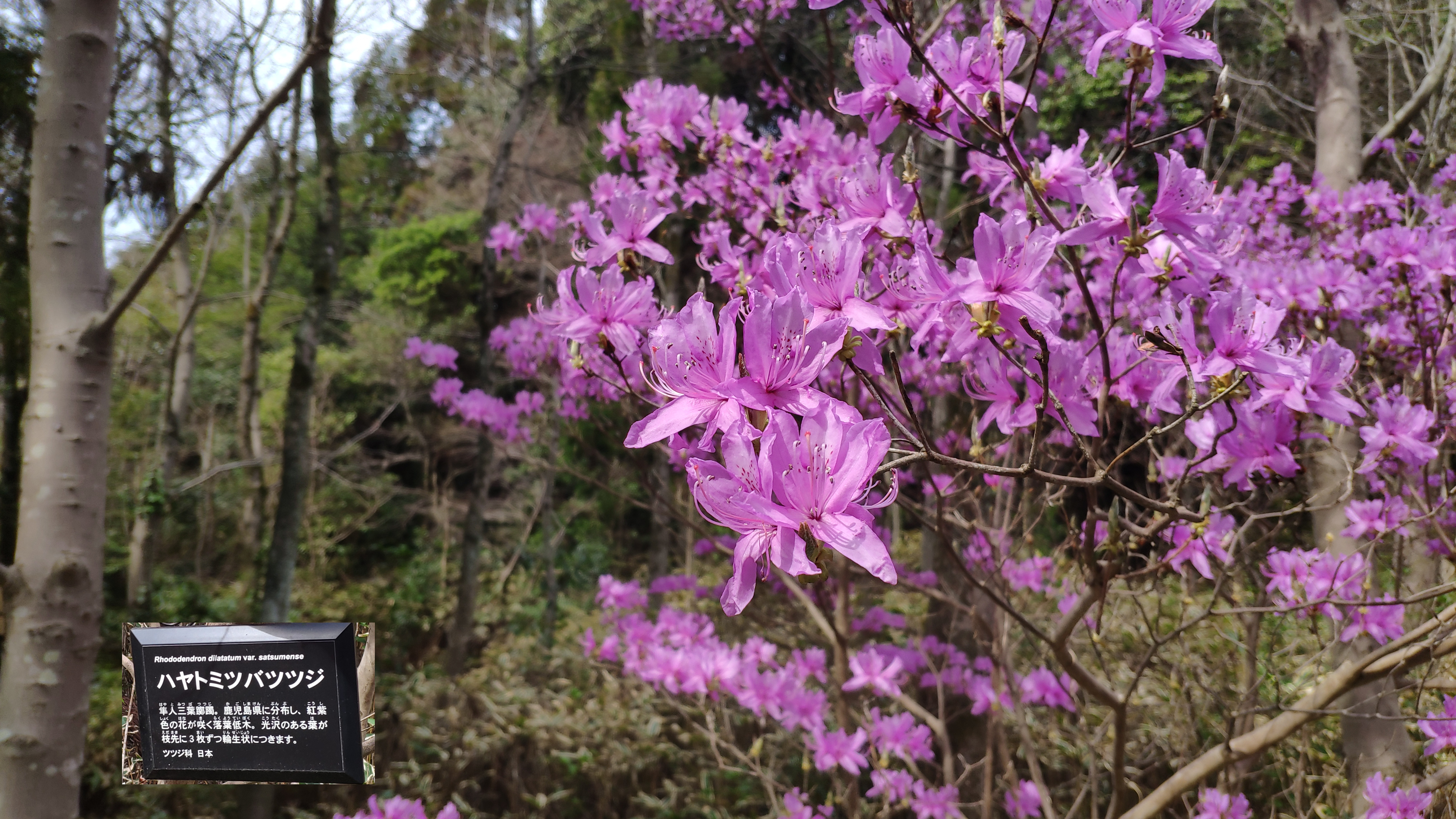しばらくは桜ではなく様々な草木を見ながら歩きます。入ってすぐの「ハヤトミツバツツジ」枝先に3枚の菱形の葉をつけることからの命名らしいです。まだ葉が出ていませんね。