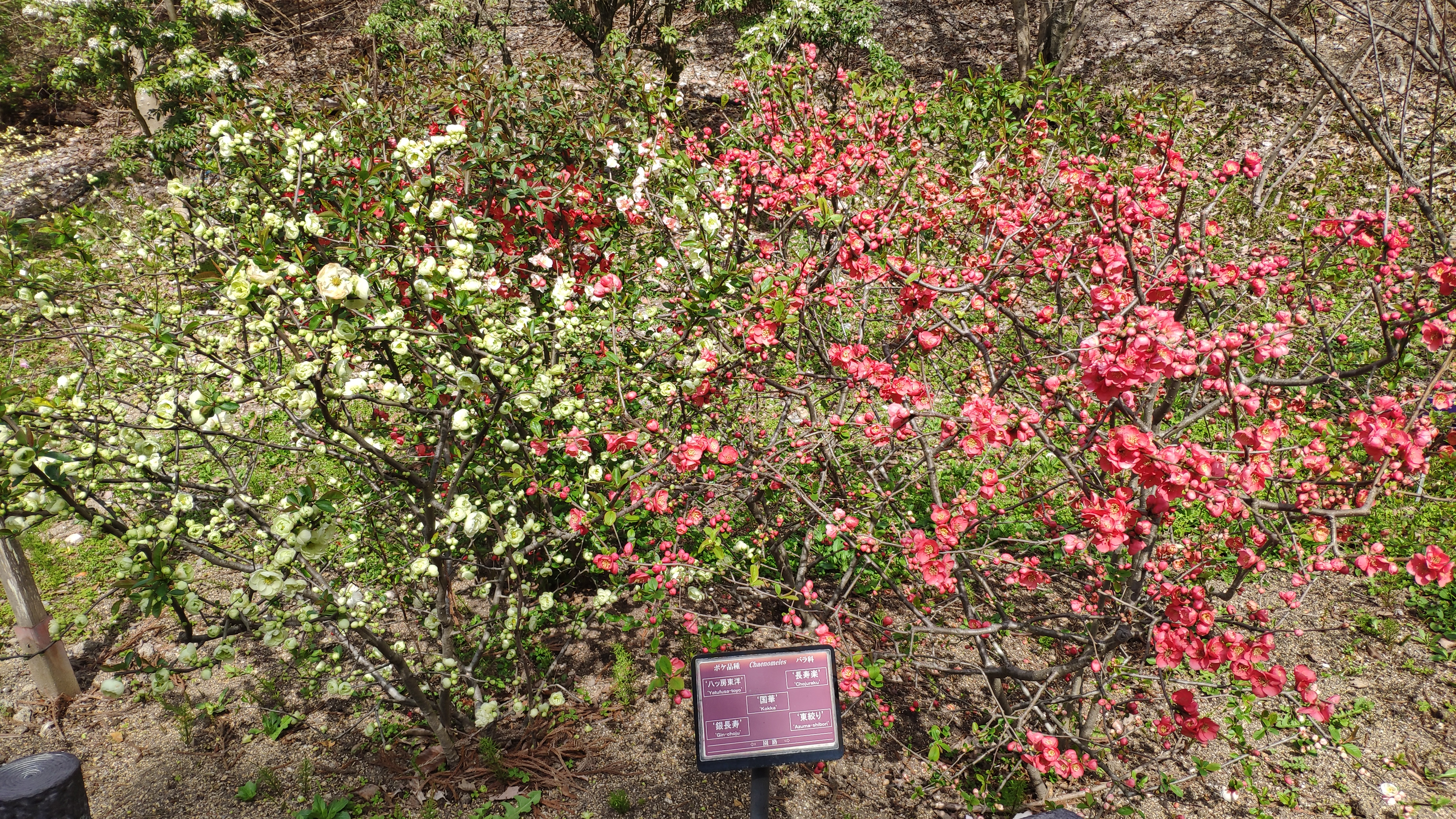 5種類の「ぼけ」が一ヶ所に植えられています。真ん中の「国華」は赤と白の花が混じり合っています。梅だけじゃなくぼけにもあるんですね。