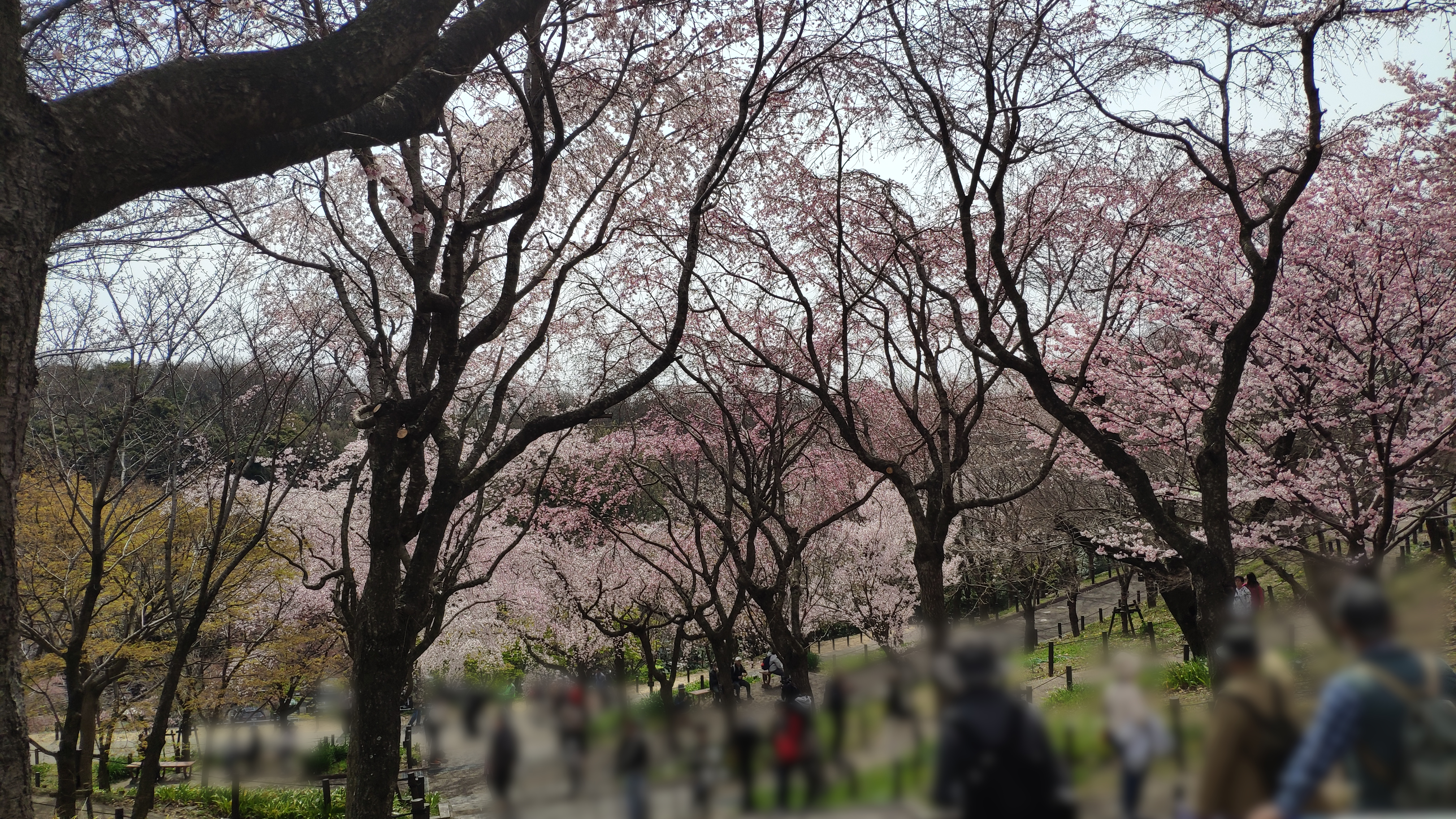 桜の回廊をぐるりとまわり、広場の休憩所の上からです。