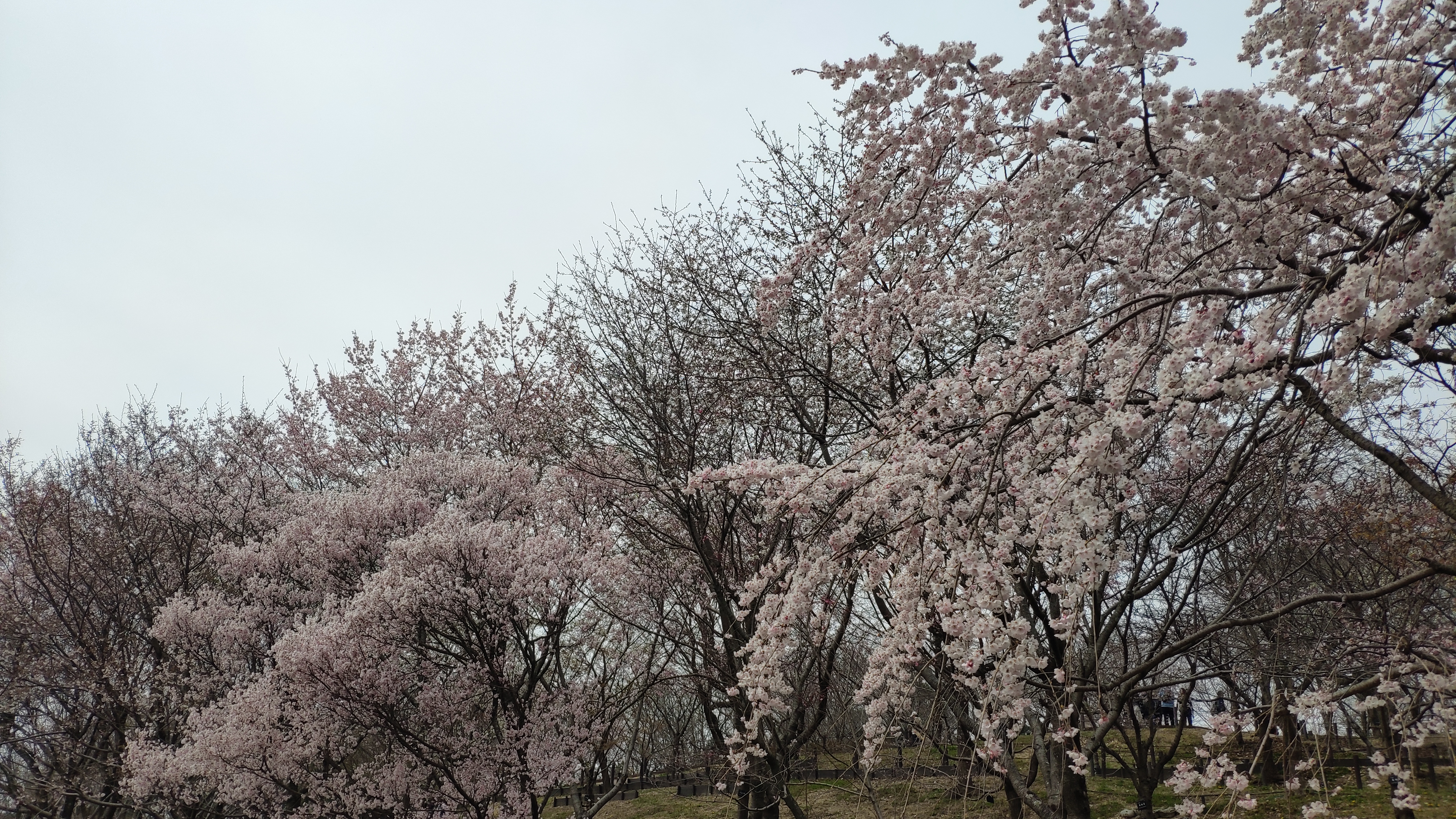 お花畑越しに桜の回廊がみえてきました。