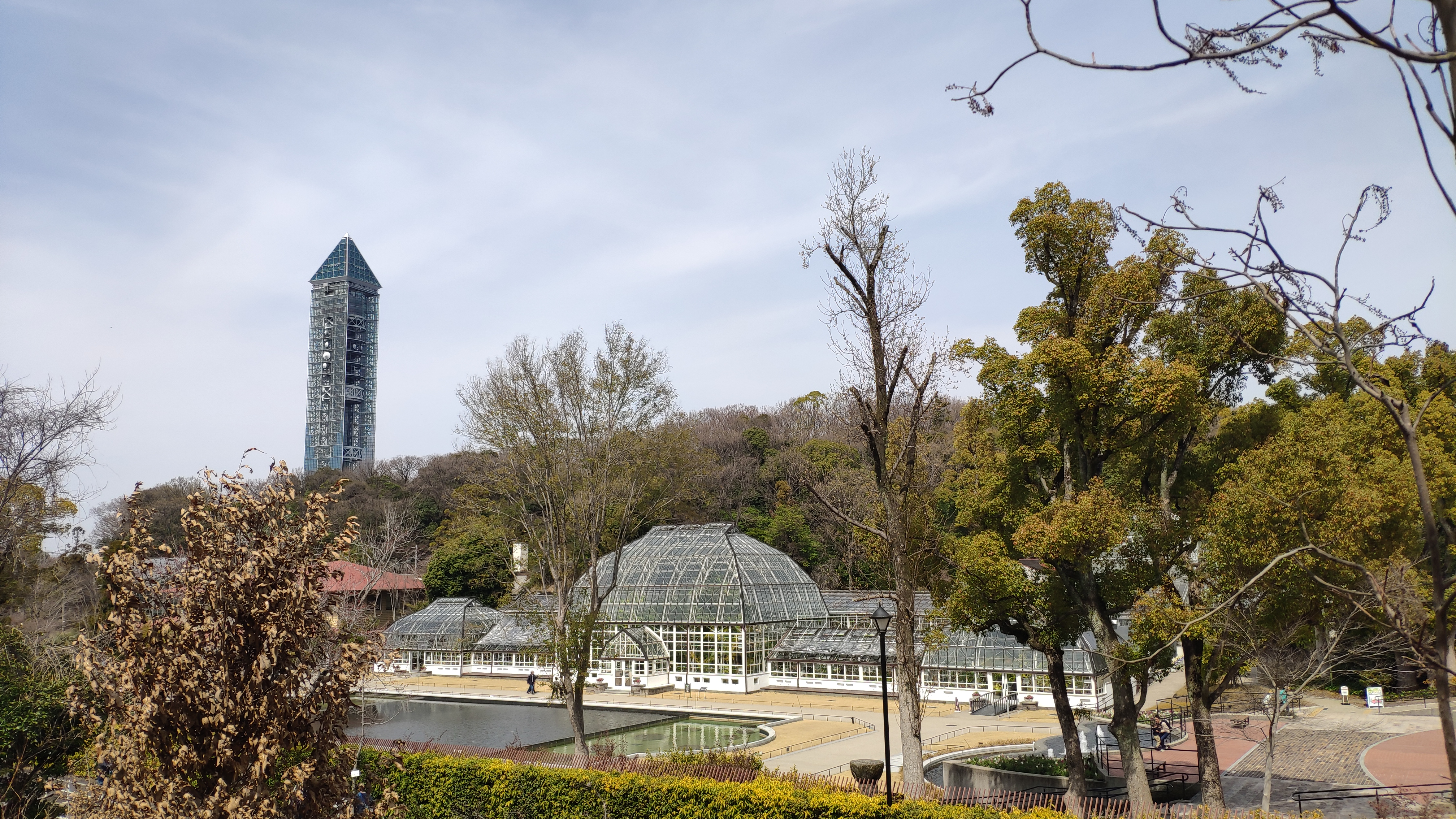 「ガーデンステージ」という場所になるんでしょうか、「スイレン池」と「温室」と「東山スカイタワー」を望みます。