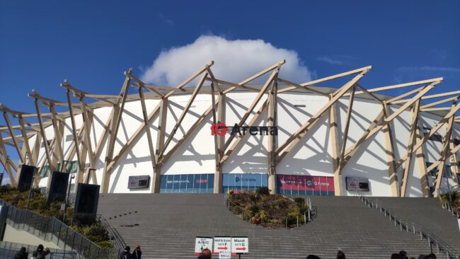 IGアリーナの正面です。今日はアイドル系のコンサートがあるようです。写真の下の方に頭だけ写っているのはアイドルの写真を手で掲げてアリーナの写真を撮っているファンたちです。