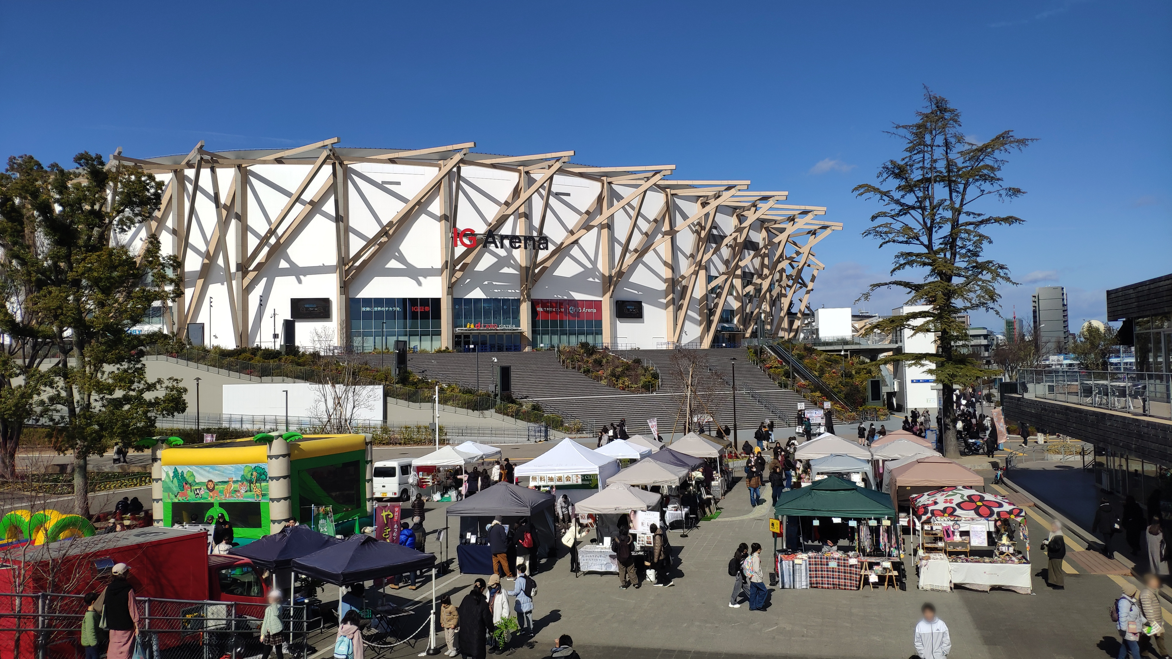IGアリーナの正面です。今日はアイドル系のコンサートがあるようです。写真の下の方に頭だけ写っているのはアイドルの写真を手で掲げてアリーナの写真を撮っているファンたちです。